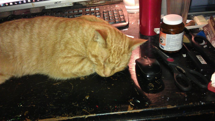 Hej alle katte-elskere, Jeg har en rød kat, som er super dejlig og velopdragen. Vi har ingen anelse om ophavet, da den i sin tid blev "lagt" af naboens hunkat, da hun var blevet spærret inde i vores hus. Umiddelbart ligner han en ganske almindelig huskat, dog med enkelte undtagelser: Han har hår i ørerne. Ikke nogen betydeligt lange hår, men helt tydeligt længere end vores andre kattes. Han har også antydningen af et "M" i panden; hvilket dog kan skyldes at han er stribet. Han er MEGET opsøgende. Han foretrækker menneskeligt selskab, og er tit med ude og gå lange ture i naturen. Uden sele. Denne opførsel er ikke særlig typisk for huskatte generelt, og jeg synes at jeg kan genkende mange småting fra min gamle maine-coon. Men igen, alt dette kan skyldes min underbevidsthed, der nok ønsker sig en MC igen... :rolleyes: Jeg vil derfor høre jer, om min kat er en ganske almindelig, ualmindelig, huskat ? Eller er der mere i ham ?