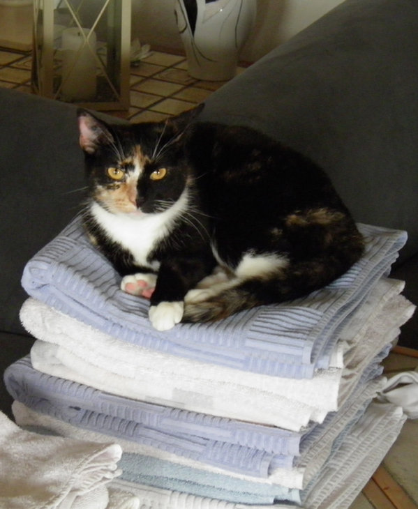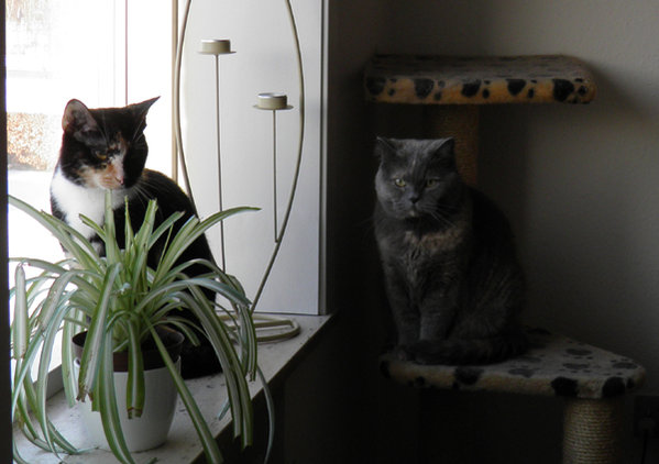 Her er ligger de pænt på vores rene vasketøj, Sally har indtaget håndklæderne der ligger på bordet, hvor hun faktisk ikke må gå. Molly nåes med vasketøjsposen, der ligger på sofaen, hun ved hvad hun må og ikke må. Her sidder de begge ved vinduet og kigger ud.