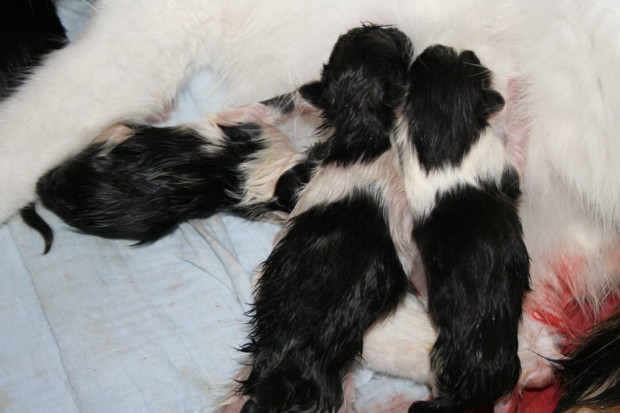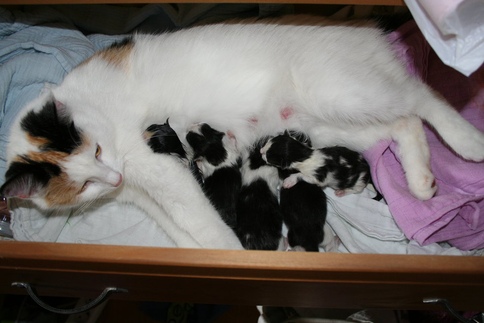 Efter en aften med en masse vandring gik vi i seng og Sherry indtog skuffen ved siden af min seng. Men kun for en kort stund - så vandrede hun videre. Jeg vågnede i morges ved at min mand fortalte at hun var kravlet ind under og op i sofaen. Og der skulle hun ihvertfald ikke lægge sine killinger, så vi kaldte hende ud og med held. Da jeg havde klædt børnene på kaldte Sherry på mig og jeg fulgte hende ind til skuffen. HUn lagde sig til rette og miavede lidt til mig. Jeg var nødt til at servere morgenmad for børnene, så jeg forlod hende. Men det ville hun ikke have - 30 sekunder efter stod hun i køkkenet og miavede af mig. Jeg fulgte efter hende ind til skuffen og vi snakkede lidt sammen. Meen jeg måtte jo videre i rutinerne. Det syntes Sherry ikke om og trådte igen an i køkkenet og kaldte krævende på mig! Hmmm jeg var ved at fatte alvoren og gav min store pige besked på at tage styringen i køkkenet og fulgte med ind i soveværelset. Sherry fik tydelige veer og den første killing kom med numsen først. Jeg måtte hjælpe hende og hev i halen sammen med hendes presseveer og efter næsten 25 minutter kom første killing ud - gudskelov levende og sprællende. en time efter kom killing 2 - igen med halen først. Også her måtte jeg hjælpe hende, men det gik dog nemmere. en time mere gik og killing 3 kom til syne - endelig en med hovedet først! 20 minutter efter kom nr 4 og så var hun TRÆT. Jeg tilbød hende en æggesnaps og hun sluprede det i sig!! 1½ time efter ville jeg fjerne noget af alt det våde og mens jeg fjerner det opdager jeg en varm nr 5 killing stadig i fosterhinden. Sherry havde slet ikke sagt noget - så jeg blev meget overrasket! Hun gad ikke rigtigt gøre det færdigt, så jeg ville hjælpe, men det var ret svært da den stadig var koblet på den ufødte moderkage. Hun lå bare og slikkede tilfældigt på de andre killinger, så jeg fjernede dem lidt og løftede hendes hoved ned til den lille nye - og så tog hun sig sammen og fødte moderkagen. Åd den og slikkede killingen lidt. Men hun var træt, så jeg tørrede den for hende. Så 5 killinger fik vi!!! Allesammen sorte og hvide og de ser næsten ens ud, så jeg har virkelig nærstuderet dem for at finde forskelle - så jeg kan kontrol veje dem. De vejer mellem 106 og 127 g - så de er vist fine:D Nu ligger de og putter i skuffen <3
