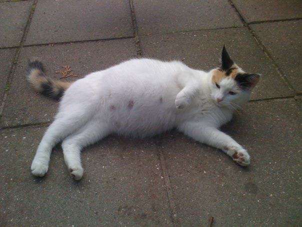 Sherry bliver trimle tyk. Det er vidunerligt at se - samtidig går tankerne tilbage til mine egne graviditeter og håber ikke på at hun har nogle smerter på grund af den øgede vægt! Hun EEELsker stadig at være ude - sover helst på kokosdørmåtten ude foran hoveddøren. Eller i den gamle fugtige kedelige barnevogn. Når det regner - som det jo gør MEGET nu, så slapper hun af på den overdækkede terrasse - ikke noget med at putte indenfor - ikke før det bliver mørkt! I går sov i sofaen - sjældent syn og hun var langt væk i drømmeland og jeg fik dette skønne billede af hendes tykke mave! Man kunne også se killingerne gå helt bananas under maveskindet og pelsen skilte sig flere gange der hvor de afleverede de masive spark!!!! Jeg fik helt sommefugle i maven og glæder mig sindsygt til de kommer ud !!! Er der noget der ud fra maven størelse kan give et bud på hvor mange killinger hun får?